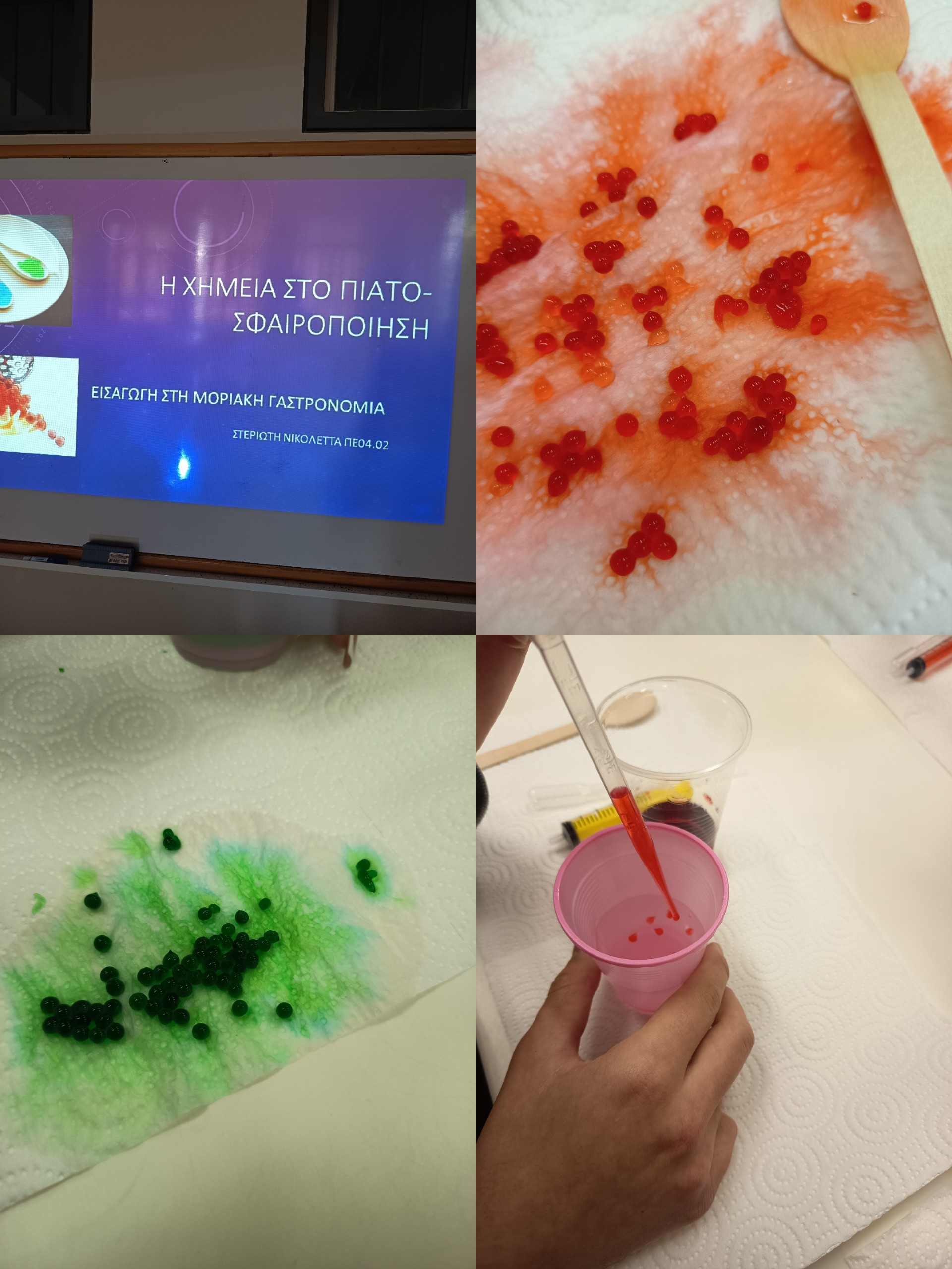 Οι μαθητές είχαν την ευκαιρία να γνωρίσουν βασικές αρχές της σύγχρονης γαστρονομικής επιστήμης, η οποία συνδυάζει τη Χημεία με τη μαγειρική δημιουργικότητα. Μέσα από βιωματική προσέγγιση, παρακολούθησαν και εφάρμοσαν την τεχνική της σφαιροποίησης, δημιουργώντας μικρές «σφαίρες» με υγρό πυρήνα, κατανοώντας στην πράξη έννοιες όπως τα διαλύματα, τα ιόντα ασβεστίου και οι αντιδράσεις πηκτωματοποίησης.